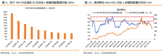 本轮上涨并非完全是系统性普涨拔估值,结构性特征相对明显,TMT领涨。当前在产业趋势下享有估值溢价的TMT对全A的涨幅贡献并未演绎至极端形态。短期贡献度视角下,AI仍未到极端过热状态。寻迹龙头并拉长时间看,以贵州茅台、宁德时代为锚,寒武纪在本段行情中对市场的涨幅贡献或仍有一定空间。